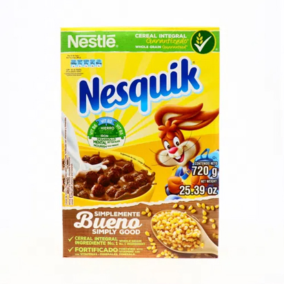Chocolate con sabor fortificada trigo y maíz, bolas de cereales sabor a chocolate crujientes . Descubre el sabor delicioso chocolate licuado en el desayuno. Cada tazón de 30 g de Nesquik le proporciona 7 vitaminas y hierro, además de calcio también.