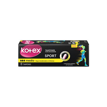 Tampones Kotex Sport con aplicador son ideales para la práctica de actividades físicas. Te brindan la máxima protección que te permite mayor movimiento para que sigas con tu día sin preocuparte por nada. Cuenta con fibras absorbentes de expansión radial que se adaptan mejor a tu cuerpo minimizando el riesgo de filtraciones. Disponible en las versiones: mini, medio y súper.